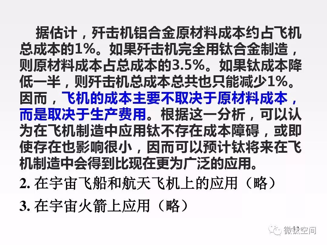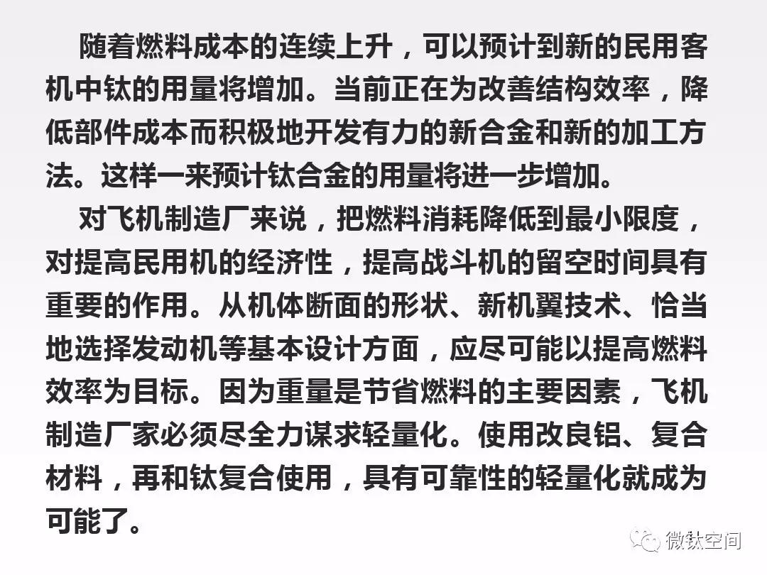 從技術(shù)和質(zhì)量上考慮,,飛行器制造工業(yè)都是金屬鈦的最大用戶,從板、管材到鑄件、鍛件,消耗鈦加工材達(dá)60%以上。在1980年前,民用機(jī)與軍用機(jī)都想在機(jī)體上采用鈦制部件,但因成本問題而受到限制。然而燃料費(fèi)在美國各主要航空公司的經(jīng)營成本中所占的比例自1970年以來一直在上升(1970年占12%,1980年占28%,1990年占31%),從而推動了具有高比強(qiáng)度的鈦部件在飛機(jī)上的廣泛應(yīng)用。因使用鈦部件而使初期投資增加的部分,可因節(jié)省航運(yùn)費(fèi)和維修費(fèi)而完全抵消。加上定期客機(jī)效率的改善,使得波音公司投資數(shù)十億美元,開發(fā)了節(jié)能效率好的757型和767型客機(jī)。